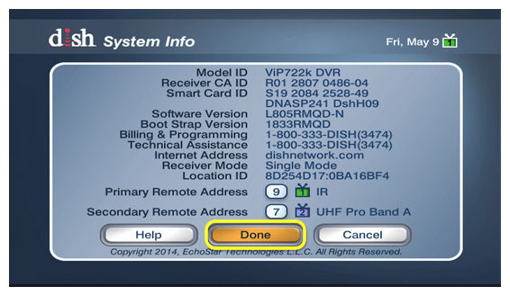 Press the SYSTEM INFO button on the front panel of your DISH receiver.